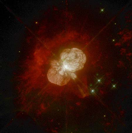 A NASA Hubble Space Telescope "natural color" image of the material surrounding the star Eta Carinae, as imaged by the Wide Field Planetary Camera 2 (WFPC-2).