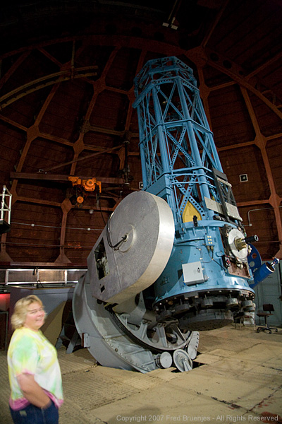 On arrival to the gate, we were ushered in by Tom Meneghini to visit the 16" Meade. We visited for a while with Tom at the 16" with really stunning views of Jupiter under a moonlit night with 2 other friends of Tom. Fred struggled to maintain propriety and keep his hands off the keypad, since he is so familiar with them - but Jen was more thumbs with the hand controller. "I'm a big dob user", Jen cited. "That is when I'm not solar observing." Once Tom was informed that Jen owns DayStar, he produced the front ERF for the 16" post haste. "The ERF glass size is too small." Jen grumbled in passing. After another few minutes joking and looking Jen suggested she should check in on the filter itself and make sure it was fully operational - if Tom was interested. So later when Superintendent, Dave Jurasevich stopped in, he escorted Fred and Jen over to the Snow solar telescope to find it. After unsuccessfully rifling through dusty cabinets in the historic telescope, we eventually found the filter mounted to a refractor, poised for use. The filter was decidedly boxed up for service at DayStar and brought back to the car. Dave walked us back into the dome of the 16" where he announced, "What are we doing looking through the 16? Let's go open up the 60 inch!" So the small troupe of us carefully closed up the Meade and moved to the epic 60" reflector.