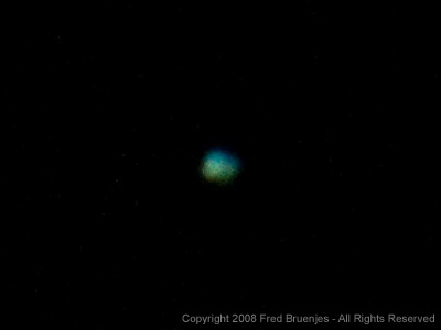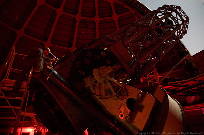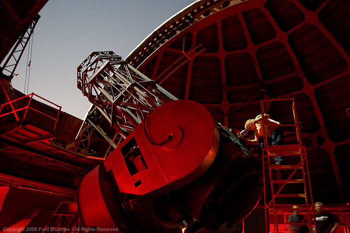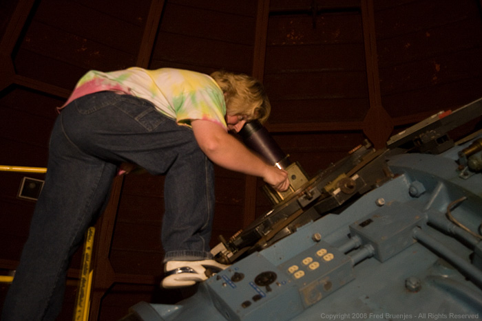 After observing each new object our giddiness grew, and before long the aperture-induced inebriation resulted in Tom, Jen, and Fred spouting our favorite Monty Python sketches and singing 'the lumberjack song' between and during peeks through the eyepiece. Eventually, the observing session would come to an end. The dome slit closed with an ominous groan and the lights brought color back to the room. Tom took the eyepiece out and as Jen was gaping at the open 4" focuser, she noticed, "It has a Telrad!" What a GREAT NIGHT! All text and images are © 2008 Fred Bruenjes and Jen Winter - All Rights Reserved. Image inlining (hotlinking) and/or framing are strictly prohibited. No reproduction, dissemination, repackaging, hosting, or other use of these images is allowed without written permission. |