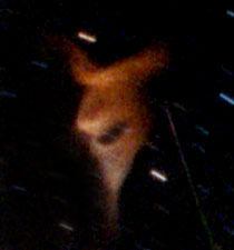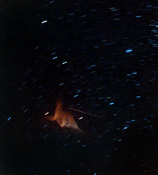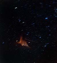 This was the first of 5 images in a series. This was a 5 minute exposure that began within one minute of the actual bolide's crossing. It was cropped from the full-circle horizon to horizon 360 degree image we took similar to those found on our main Leonid page. On processing, we were immediately struck by the apparant facelike image that appeared in this shot. Many other amateur astronomers in the tri-state area would talk about this enormous once in a lifetime meteor.
