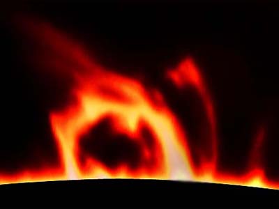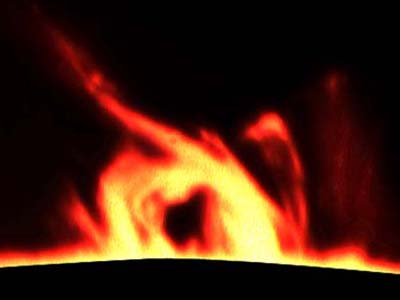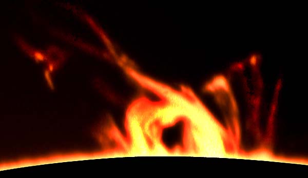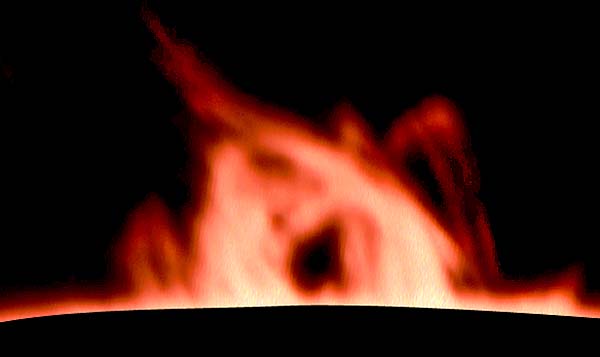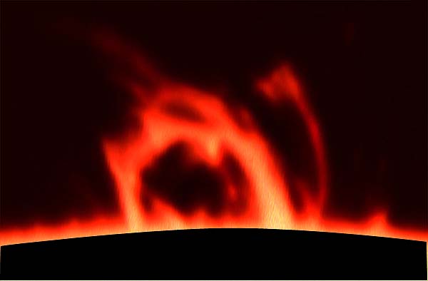 2001-04-15 - Photographs taken between 18:0:00 UT and 22:30:00 UT. Rotation 1975 - Location: Roeland Park, Kansas, USA. 4.75 inch refractor operating at f30 with prototype .4 angstrom prominence filter. Sky: Mostly clear - windy. Kodak Tech Pan 2415 film. Enhanced with Adobe Photoshop. All Photos (C)2001 by Vic & Jen Winter/ICSTARS Astronomy.