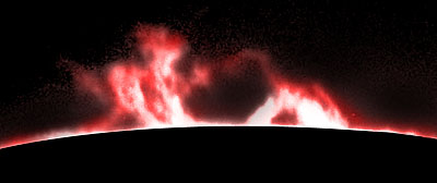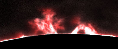 2001-08-29 - Photographs taken between 20:20:00 UT and 20:50:00 UT. Rotation 1980 - Location: Roeland Park, Kansas, USA. 4.75 inch refractor operating at f30 with prototype .4 angstrom prominence filter. Sky: Hazy w/ clouds. Seeing: Fair to Good. Thunderstorms nearby! Kodak Tech Pan 2415 film. Enhanced with Adobe Photoshop. All Photos (C)2001 by Vic & Jen Winter/ICSTARS Astronomy.