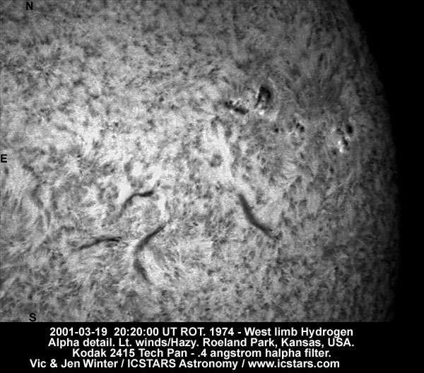 2001-03-19 - Photographs taken between 20:00:00 UT and 20:50:00 UT. Rotation 1974 - Location: Roeland Park, Kansas, USA. 4.75 inch refractor operating at f30 with prototype .4 angstrom prominence filter. Sky: Hazy. Kodak Tech Pan 2415 film, Scanned in color. Enhanced with Adobe Photoshop. All Photos (C)2001 by Vic & Jen Winter/ICSTARS Astronomy.