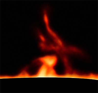 2001-03-22 - Photographs taken between 19:30:00 UT and 20:00:00 UT. Rotation 1974 - Location: Roeland Park, Kansas, USA. 4.75 inch refractor operating at f30 with prototype .4 angstrom prominence filter. Sky: Clear. Kodak Tech Pan 2415 film, Scanned in color. Enhanced with Adobe Photoshop. All Photos (C)2001 by Vic & Jen Winter/ICSTARS Astronomy.