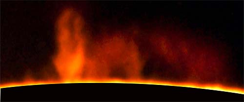 2001-03-23 - Photographs taken between 19:30:00 UT and 20:00:00 UT. Rotation 1974 - Location: Roeland Park, Kansas, USA. 4.75 inch refractor operating at f30 with prototype .4 angstrom prominence filter. Sky: Clear. Kodak Tech Pan 2415 film, Scanned in color. Enhanced with Adobe Photoshop. All Photos (C)2001 by Vic & Jen Winter/ICSTARS Astronomy.
