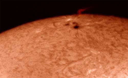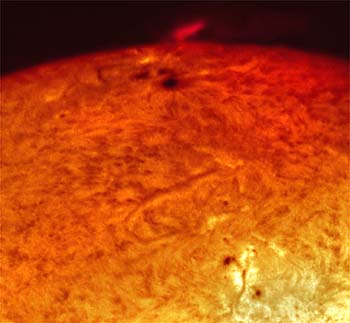 2001-03-23 - Photographs taken between 19:30:00 UT and 20:00:00 UT. Rotation 1974 - Location: Roeland Park, Kansas, USA. 4.75 inch refractor operating at f30 with prototype .4 angstrom prominence filter. Sky: Clear. Kodak Tech Pan 2415 film, Scanned in color. Enhanced with Adobe Photoshop. All Photos (C)2001 by Vic & Jen Winter/ICSTARS Astronomy.