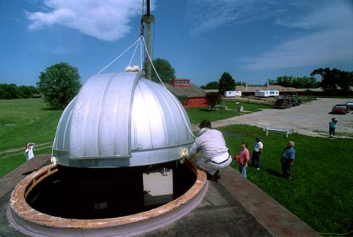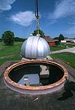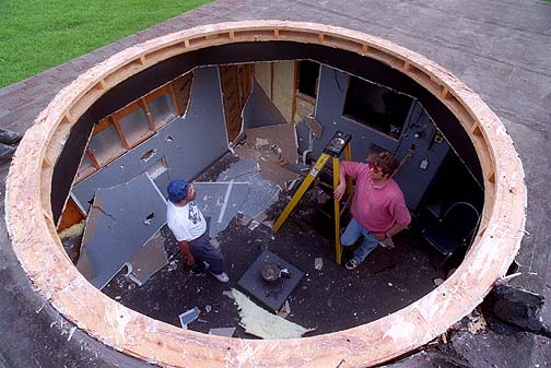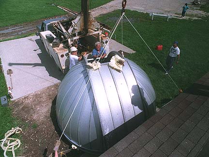 Secured by ropes to keep the dome from swinging in the high winds, the dome is slowly moved off the roof.