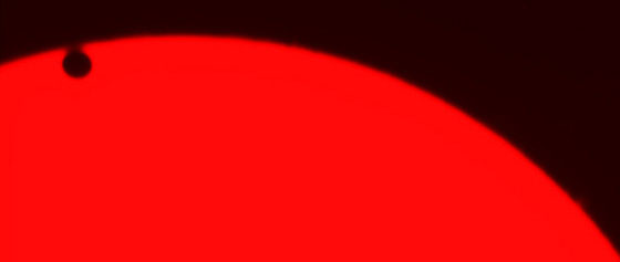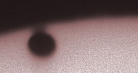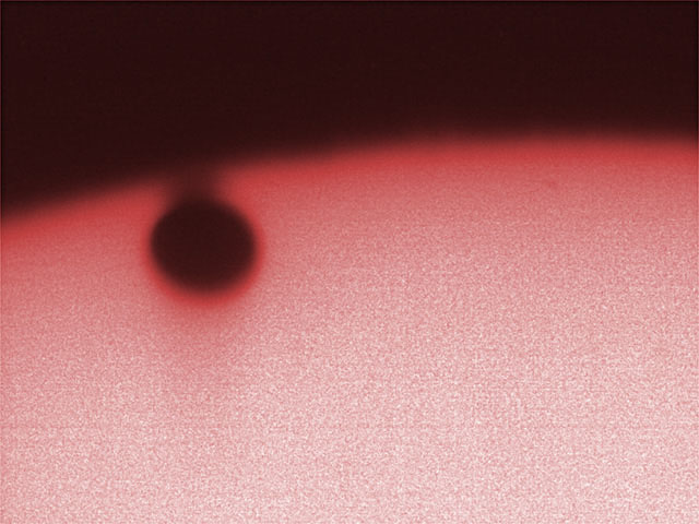 (C)2004 Vic & Jen Winter/ ICSTARS Astronomy - These three images were taken with a 4 inch refractor and a Solarin .3 angstrom Hydrogen Alpha filter. The top image was and over-exposed frame taken with a 35mm format camera on Kodak Tech Pan film. The bottom two images were photographed with the same filter using a medium format camera and Tech Pan film. Note not only the apparent "blackdrop" effect, but the glow around the disk of Venus.